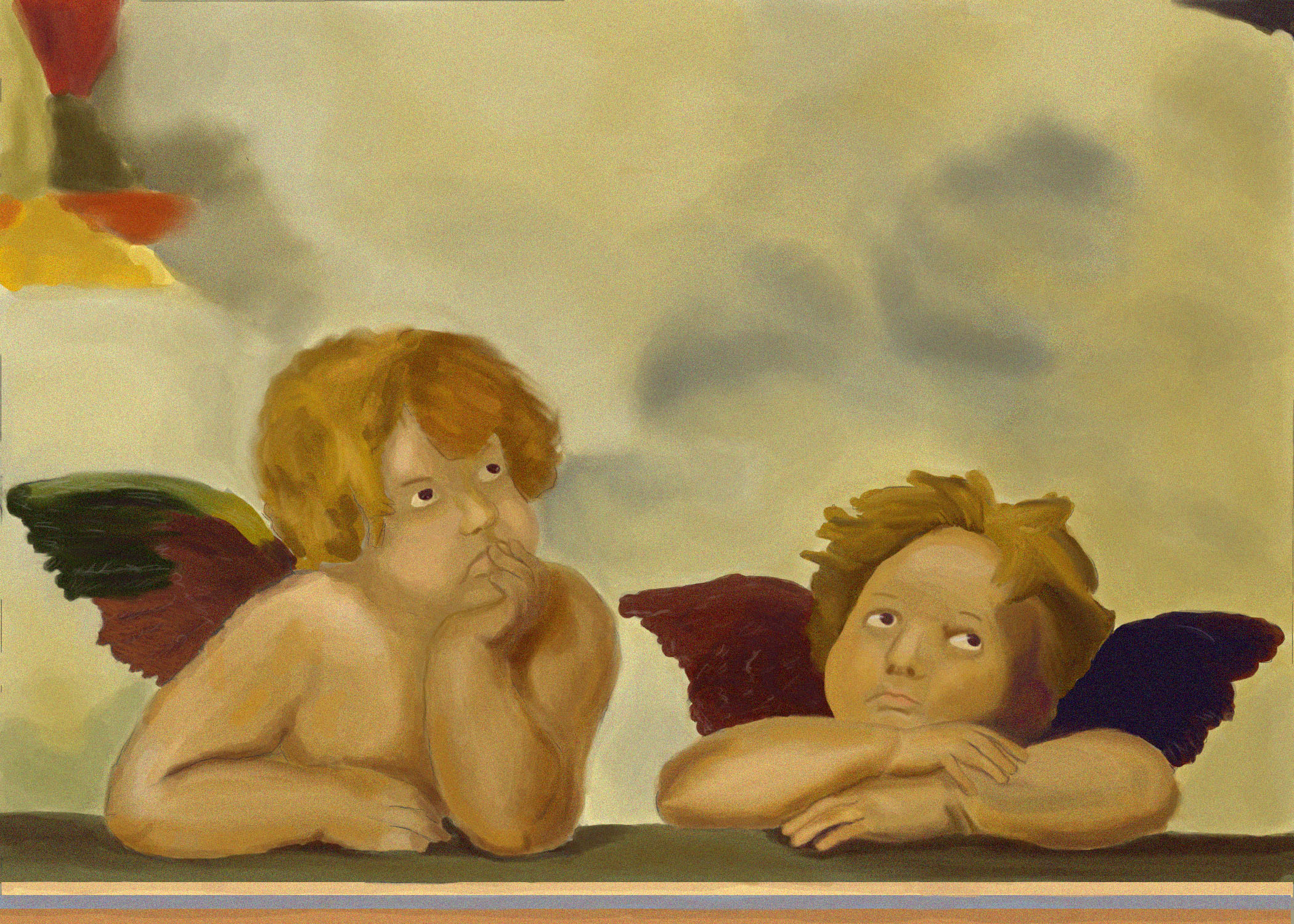 Angels Master Study, painted in Photoshop 2017Giant Schnauzer, pencil on paper, 2018Space Man, oil pastel on paper, 2016Mother’s Hands, pencil on paper, 2016Learned Ladies, scenery design, 2012Castle scenic painting, paint on muslin, 2013Learned Ladies frame design, water color on water color paper, 2012Enlarged print scenic painting, paint on muslin, 2013Light study, oil pastel on tinted paper, 2016